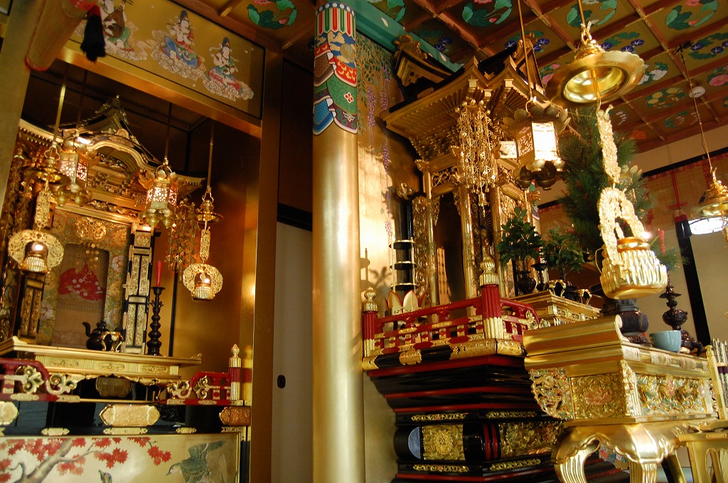 2010年が終わりに近づく12月の中旬、当山内陣外陣の漆塗り、箔押し、彩色、壁画 の施工工事が完工いたしました。