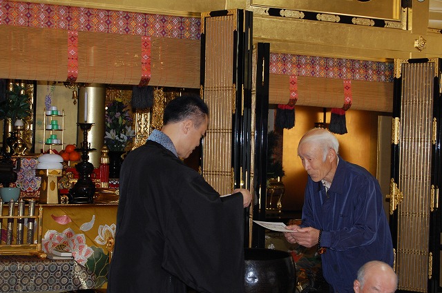 ▲役員退任者に感謝状と記念品の贈呈(長い間、お寺のためにありがとうございました。)