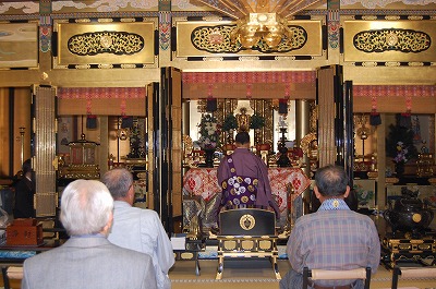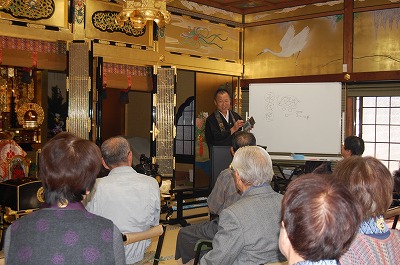 参詣者全員で仏説阿弥陀経をお勤めし、住職による法話、引き続いて