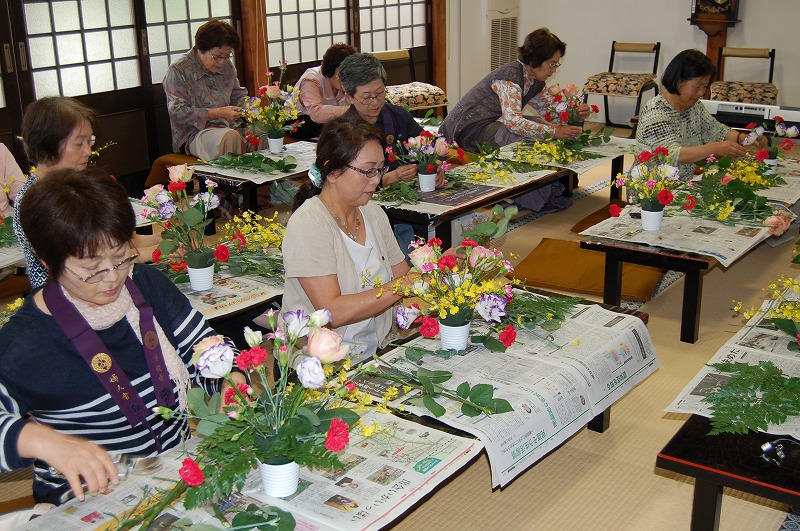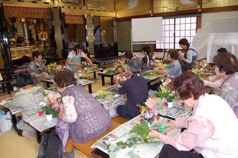 市原リミコ会長の挨拶、住職挨拶に引き続き、平成26年度決算の承認、兵庫教区岡山南組仏教婦人会連盟報告を篠原久代南組仏婦連盟会長(平成27年度より三年任期)より頂き、続いて、DVD『親鸞の見た風景』の鑑賞、坊守指導による『アレンジメントフラワー』を行いました。