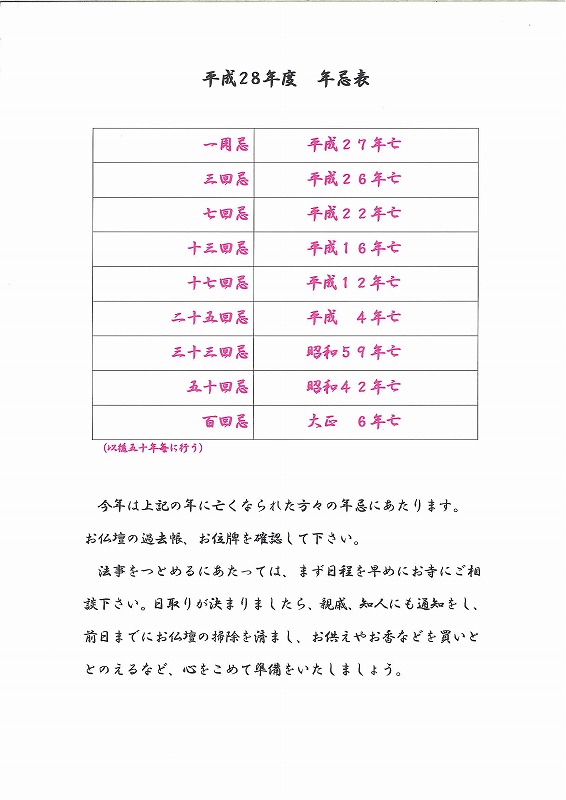 平成28年は下記の年に亡くなられた方々の年忌にあたります。