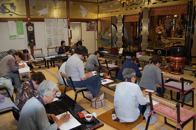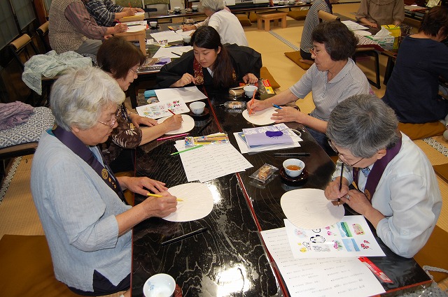 勤行(讃仏偈)の後、市原仏婦会長、住職の挨拶に引き続き、平成29年度決算報告、岡山南組仏婦連盟報告、住職による講義『重誓偈』の写経と解説、オリジナルうちわ作りを行いました。