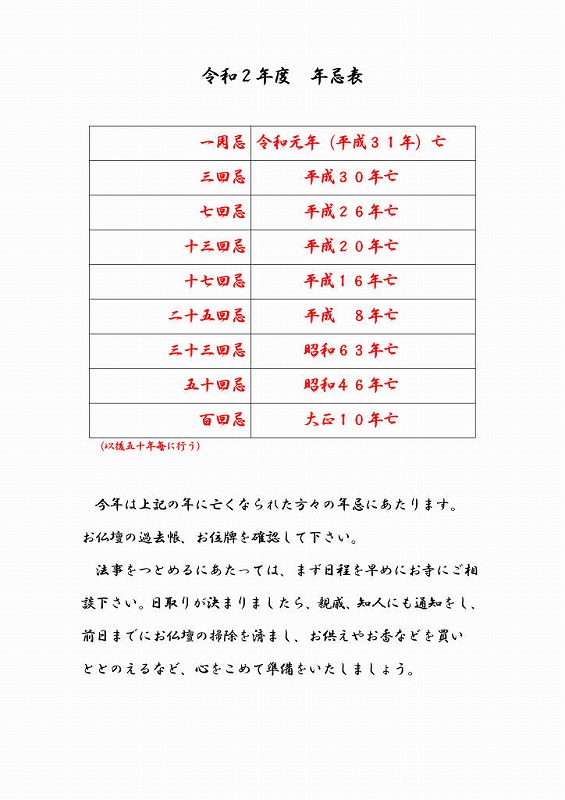 令和2年度 年忌のお知らせ