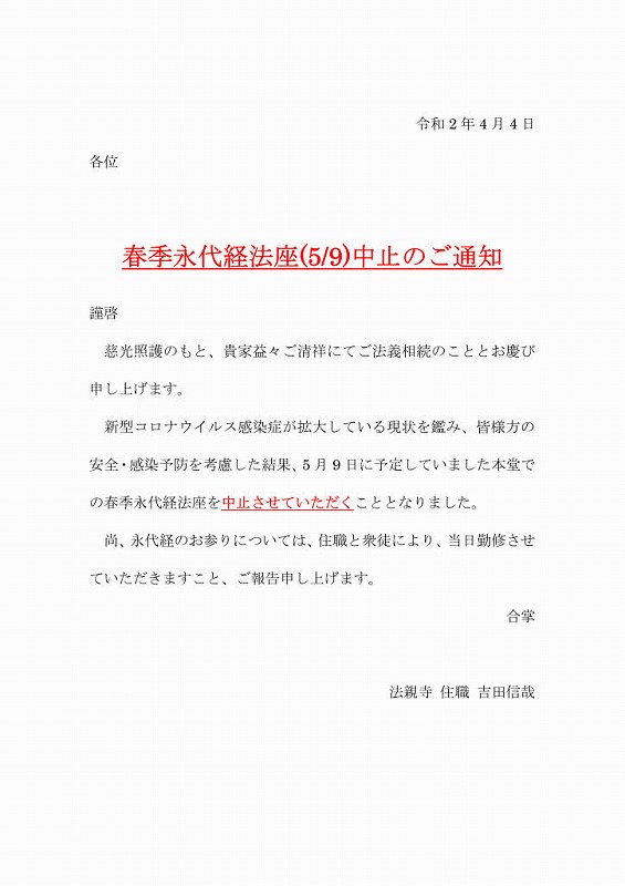 新型コロナウイルス感染症の影響により、春季永代経法座を中止させていただきます。