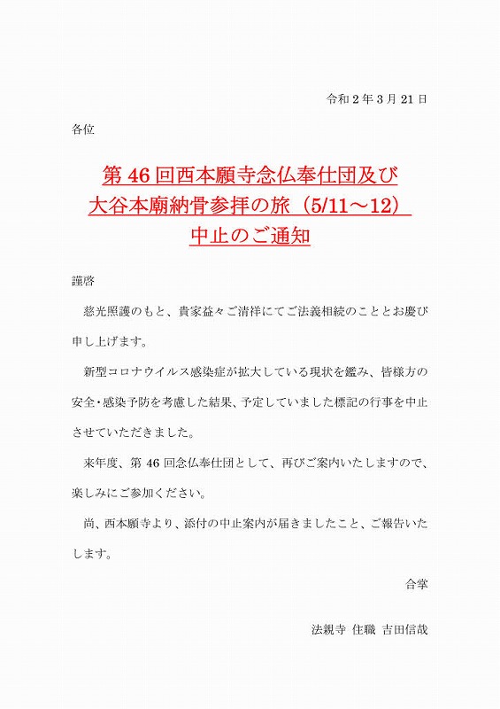 第46回西本願寺念仏奉仕団及び 大谷本廟納骨参拝の旅(5/11~12) 中止のご通知