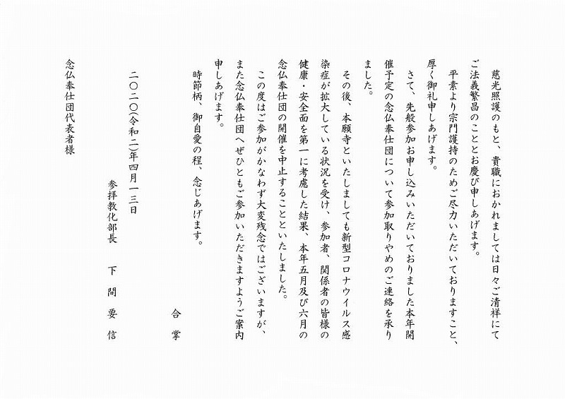 第46回西本願寺念仏奉仕団及び大谷本廟納骨参拝の旅(5/11~12)中止のご通知
