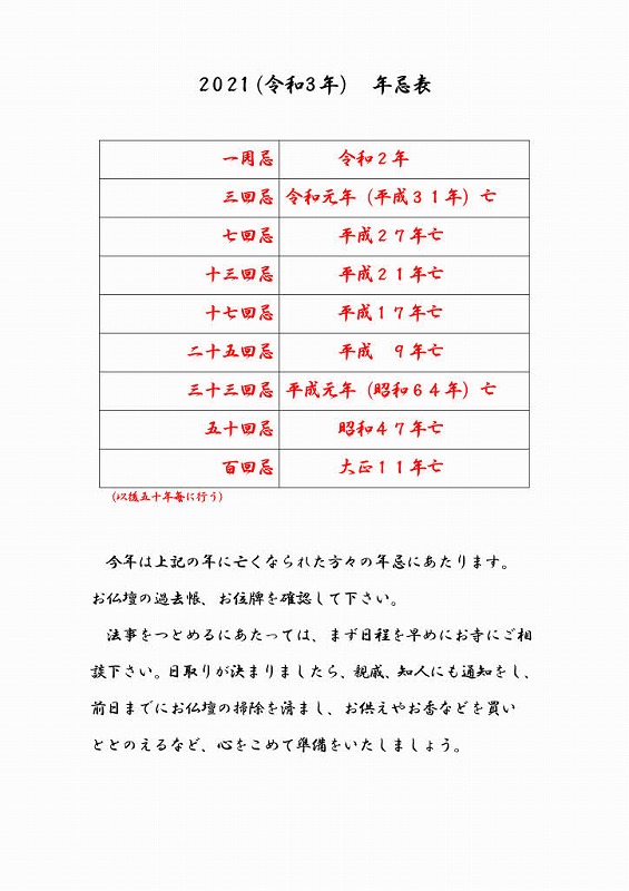 令和3年は下記の年に亡くなられた方々の年忌にあたります。