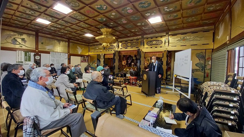 年末の除夜の鐘に続く行事は昨年の報恩講以来で、その間、春秋永代経法座や盆法座、西本願寺念仏奉仕団、婦人会の行事など、多数の集まりが中止となりましたが、マスクの着用、手指の消毒、換気を行い、時間を短縮して法要を勤修させていただきました。