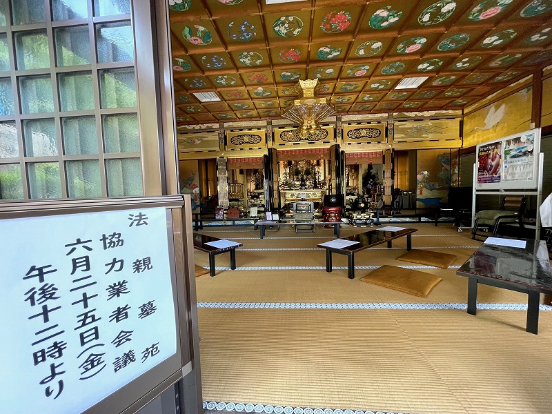 法親寺では、定期的に所有の墓苑の協力業者会議を開催しています。本日は法親墓苑指定業者5社の石材業者の皆様にお集まりいただき、本堂でのお参り、昼食をとりながらの会議を行い、墓苑利用者へのサービス向上と 規約や法規、取り決め事項について、再確認させていただきました。