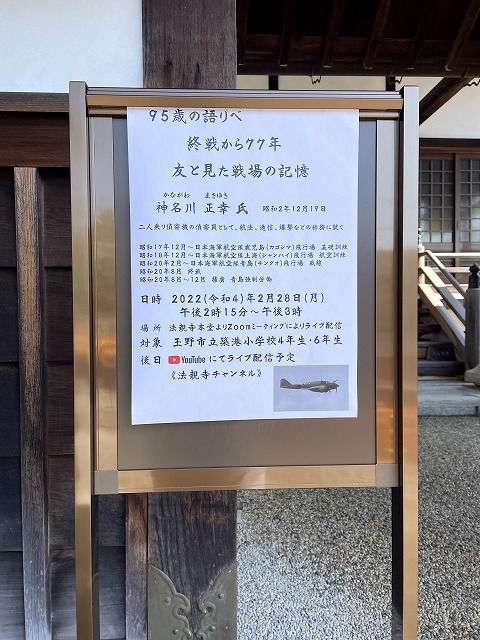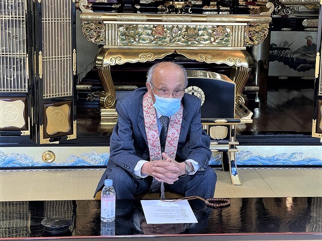 ご門徒の神名川さんにお寺にお越しいただき、本堂から築港小学校4年生と6年生の教室にZoomミーティングで、「95歳の語りべ」を配信させていただきました。また、後半に質問コーナーを設け、神名川さんと子どもたちとの対談を行いました。