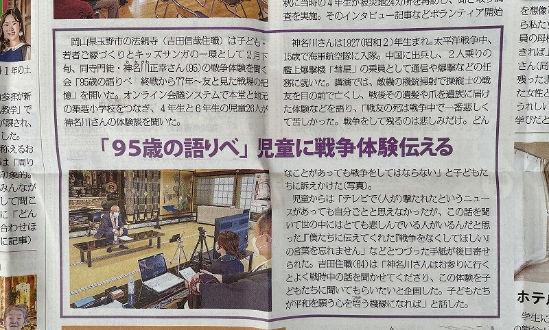 「本願寺新報」5月1日号にお寺で開催した「95歳の語りべ 終戦から77年 友と見た戦場の記憶」が掲載されました‼️
