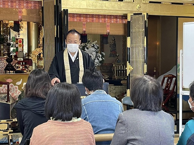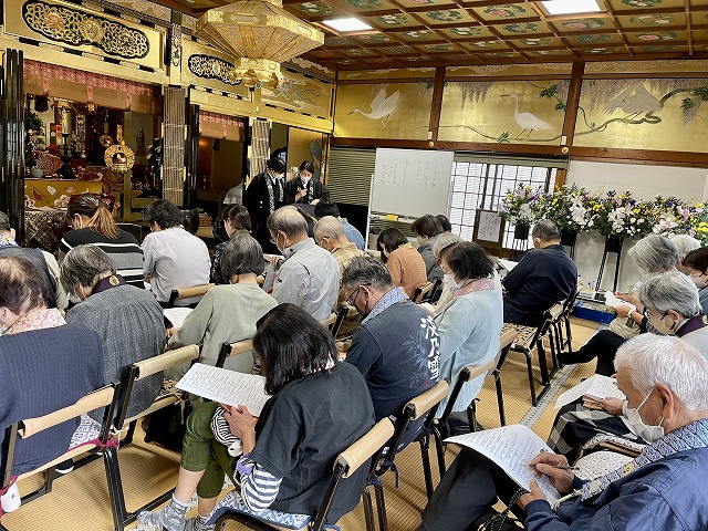参詣者全員で仏説阿弥陀経をお勤めし、住職による法話、「亡くなった人と再会できる方法について」、仏教、浄土真宗の教えから聴聞していただきました。
