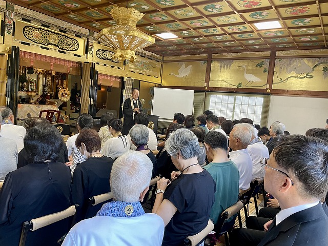 住職を導師として、参詣者全員で『仏説阿弥陀経』をお勤めし、引き続き、住職の法話をご聴聞いただきました。