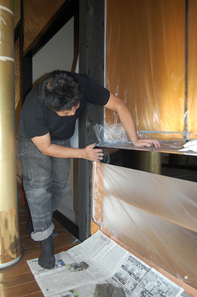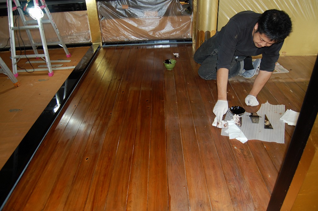 ▲内陣床の擦り漆の工程