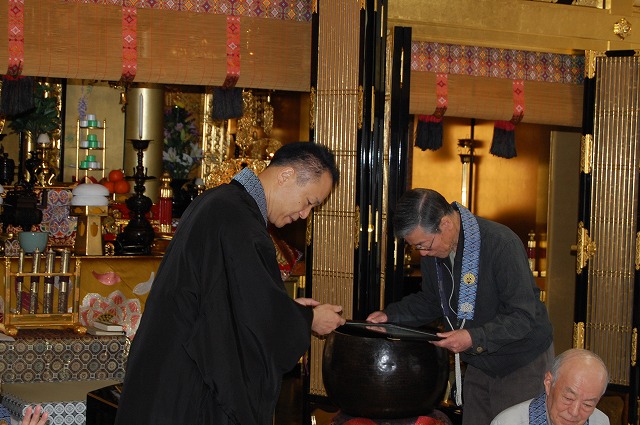 ▲役員退任者に感謝状と記念品の贈呈(長い間、お寺のためにありがとうございました。)