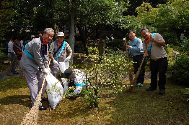 金閣、銀閣とともに京都三名閣の一つ、秀吉の建てた聚楽第の一部ともいわれている国宝「飛雲閣」前の庭(滴翠園)などを掃除させていただきました。