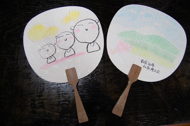 勤行(讃仏偈)の後、市原仏婦会長、住職の挨拶に引き続き、平成29年度決算報告、岡山南組仏婦連盟報告、住職による講義『重誓偈』の写経と解説、オリジナルうちわ作りを行いました。