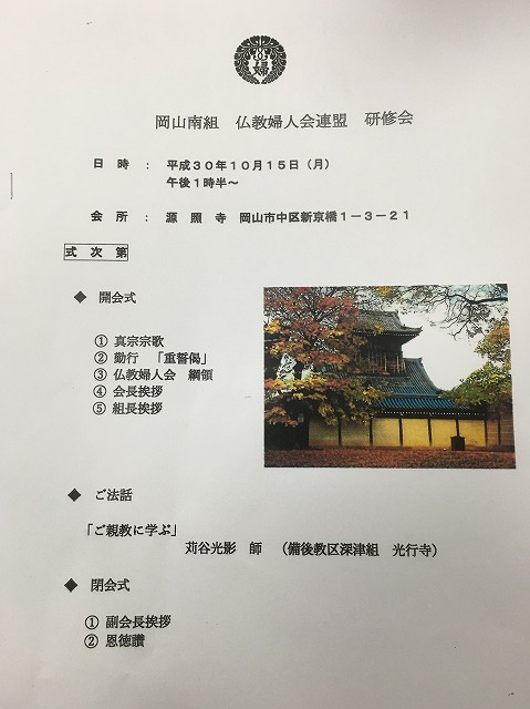 岡山南組仏教婦人会連盟研修会 平成30年10月15日