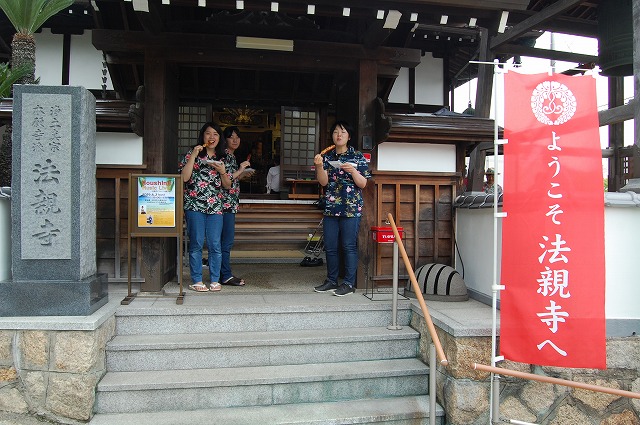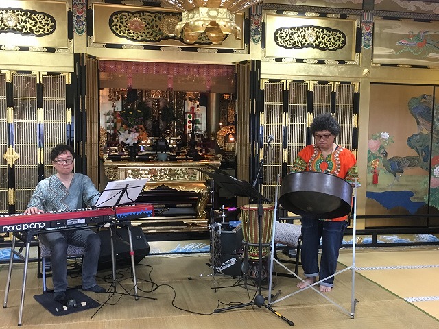 ご門徒の皆さまにお寺での音楽会ならではの雰囲気の中、中南米の調べをお楽しみいただきました。山村誠一さんは法親寺のご門徒で、ラテン系パーカッショニストです。全国で様々なアーティストと共にライブを行っており、テレビ番組やラジオにも出演、コメンテーターとしても活躍中のマルチ奏者・作曲家です。劇団四季ミュージカル「ライオンキング」大阪公演にも楽師として出演されました。