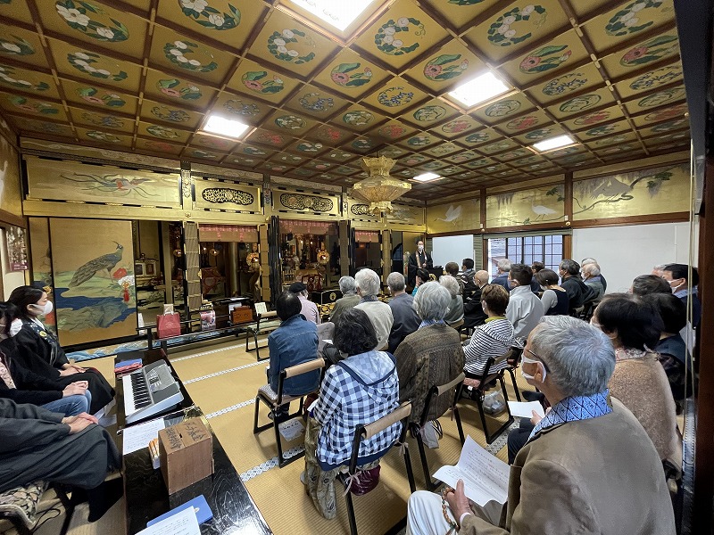 先生からご門徒宛、事前に「お聴聞は温泉に浸かるようなものです。どうぞ気楽に心ゆくまでお浸かり下さい。お湯のはたらきは勝手に体に染み渡りますから」とのメッセージをいただいておりましたが、そのお言葉の通り、皆様、先生のご法話を通して、お念仏の温泉にゆっくりと浸かった心持ちになりました。