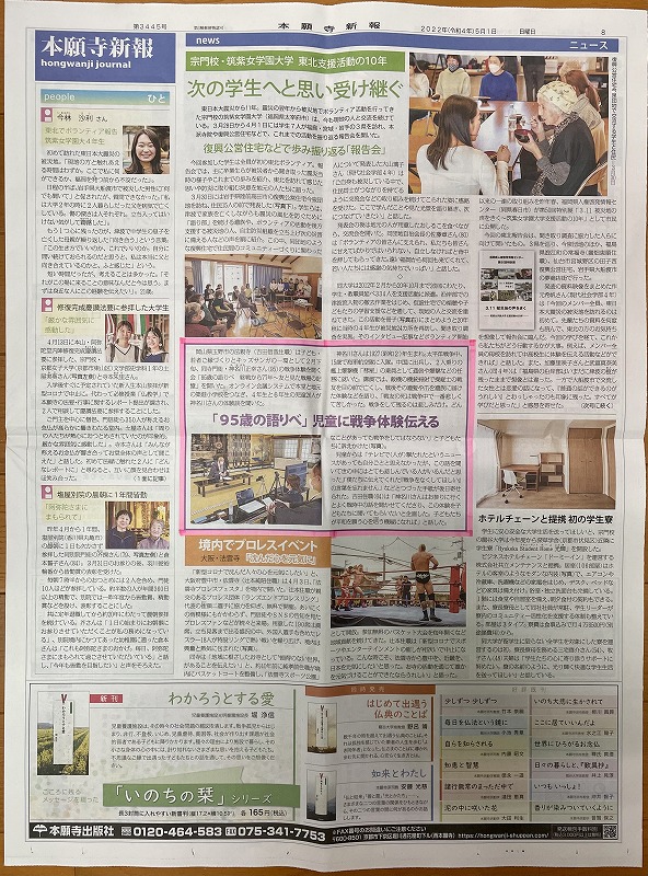 「本願寺新報」5月1日号にお寺で開催した「95歳の語りべ 終戦から77年 友と見た戦場の記憶」が掲載されました‼️