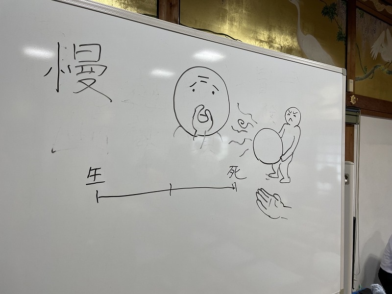 『漫画』の言葉の意味、お盆の意味について、『卵が先か、ニワトリが先か』のイラストを使ってのお話、『二羽の白鳥とカメの仏教説話』を紙芝居にしてお話など、楽しく仏法を聴聞させていただきました。