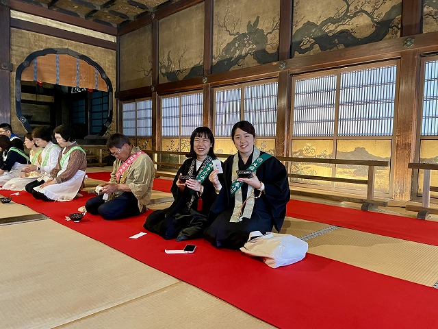 二日目は早朝、開門前から門前に並び、阿弥陀堂・御影堂での御晨朝にお参りしました。その後は境内地各所の清掃奉仕、国宝「鴻の間」でのお抹茶とお菓子(松風)のおもてなし、書院の拝観、国宝「飛雲閣」の拝観を行いました。
